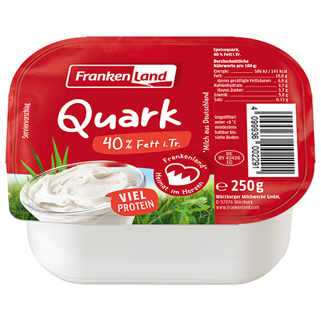 Frischer, hochwertiger Quark mit 40 % Fett von Frankenland ist der köstliche Begleiter einer guten Küche. Er ist ideal zum Kochen und Backen, schmeckt in Kuchen ebenso gut wie mit Früchten.