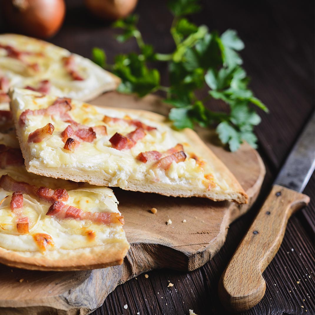 - Zwiebeln in feine Ringe schneiden, gleichmäßig auf den Teigstücken verteilen und mit Speck bestreuen.