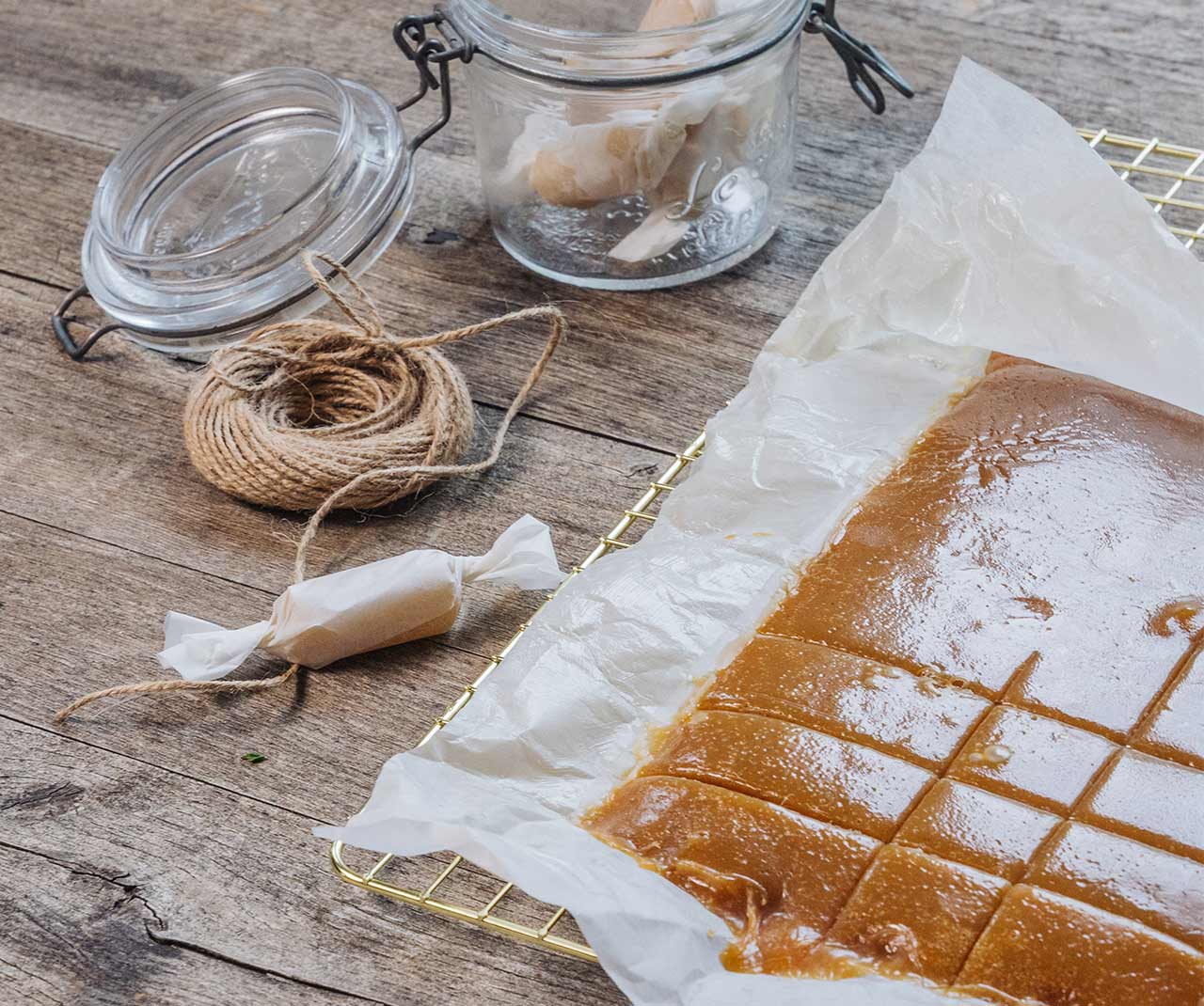 - Karamellmasse mit dem Backpapier aus der Kastenform heben, zu einer Rolle formen und mit scharfem Messer zu glatten Bonbons schneiden.